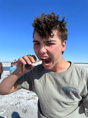 Our creative cooks worked hard and planned for what our lunch and dinner would be, while the rest of our large TWB family shopped around for snacks and activities to keep them entertained for the day ahead. We watched safely in the parking lot as the local sheriff tried to capture two dogs running in the road (we hope he finally got them). As we set off once more, the fun filled our rides as Dallas and our councilors found ways to keep us awake. Dallas and Alicia hosted a lively spelling bee, pump-in karaoke, and an intense game of uno in one of our Vans. Shout out to Ella for being our TWB '23 spelling bee champ! We had a nutritious lunch of caesar salad wraps and chips that were hits all around. We made a quick pit stop to use the restroom and fill up our water bottles (Yes mom we're staying hydrated!). Once we had our mid day naps and more exciting games, we looked out the windows to see the big ole WELCOME TO UTAH sign! We set our watches one hour closer to home and the salt flats came rollin by. We made a quick stop to potty and explore a bit of the muddy slaty mess, apparently this is not normal for it to be so muddy. (We are so sad and very appreciative to our bus cleaners (Grumpy's) as they had so much to clean!) Some made the brave decision to taste the salt but quickly regretted it, they became salty very quickly.